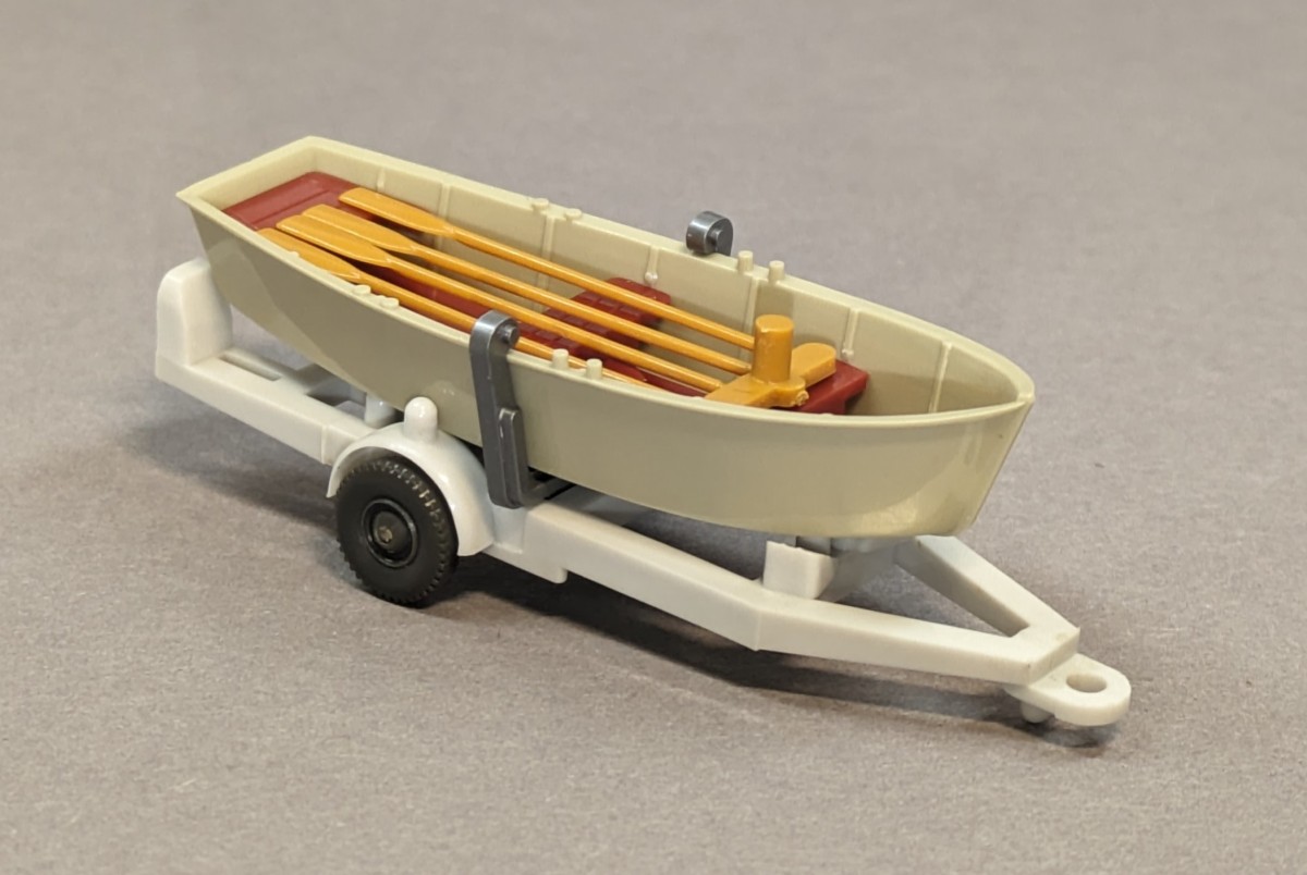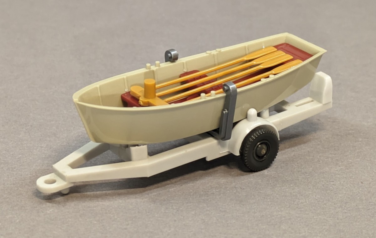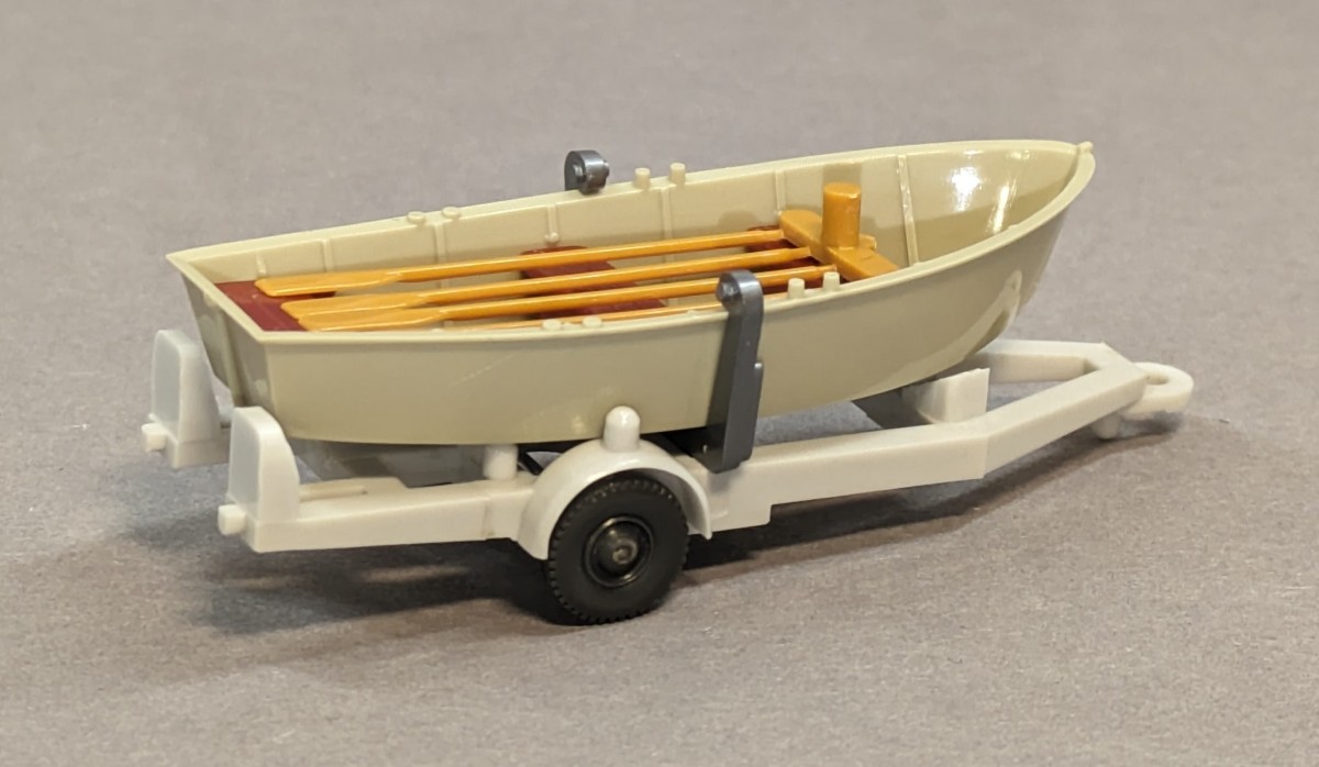 - Bootsrumpf hellgelbgrau, Einsatz hellbraunrot- Ruder senfgelb (am Spritzling)- Anhänger altweiß mit silberner Halterung- GK 94/1 Jg.aa- etwa 1970/71NEUWERTIGER ZUSTAND