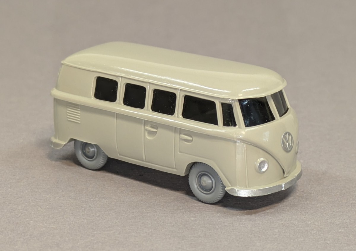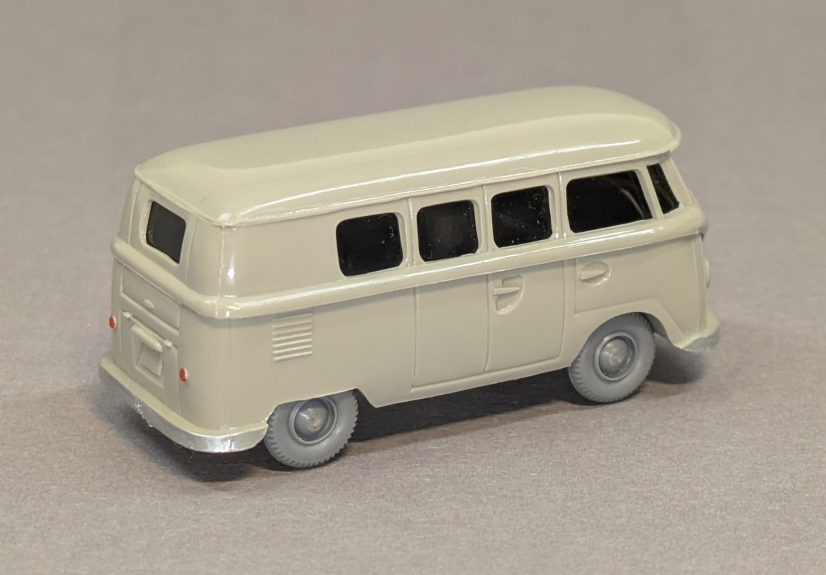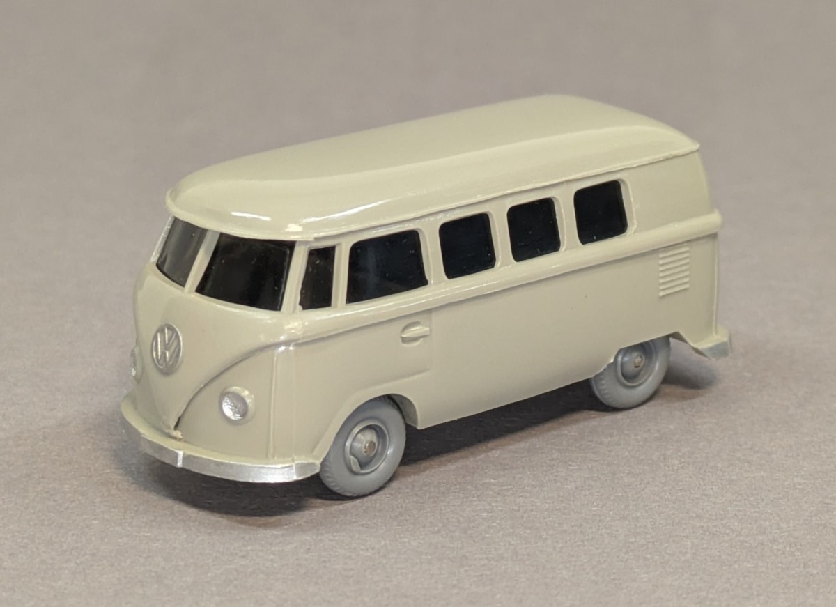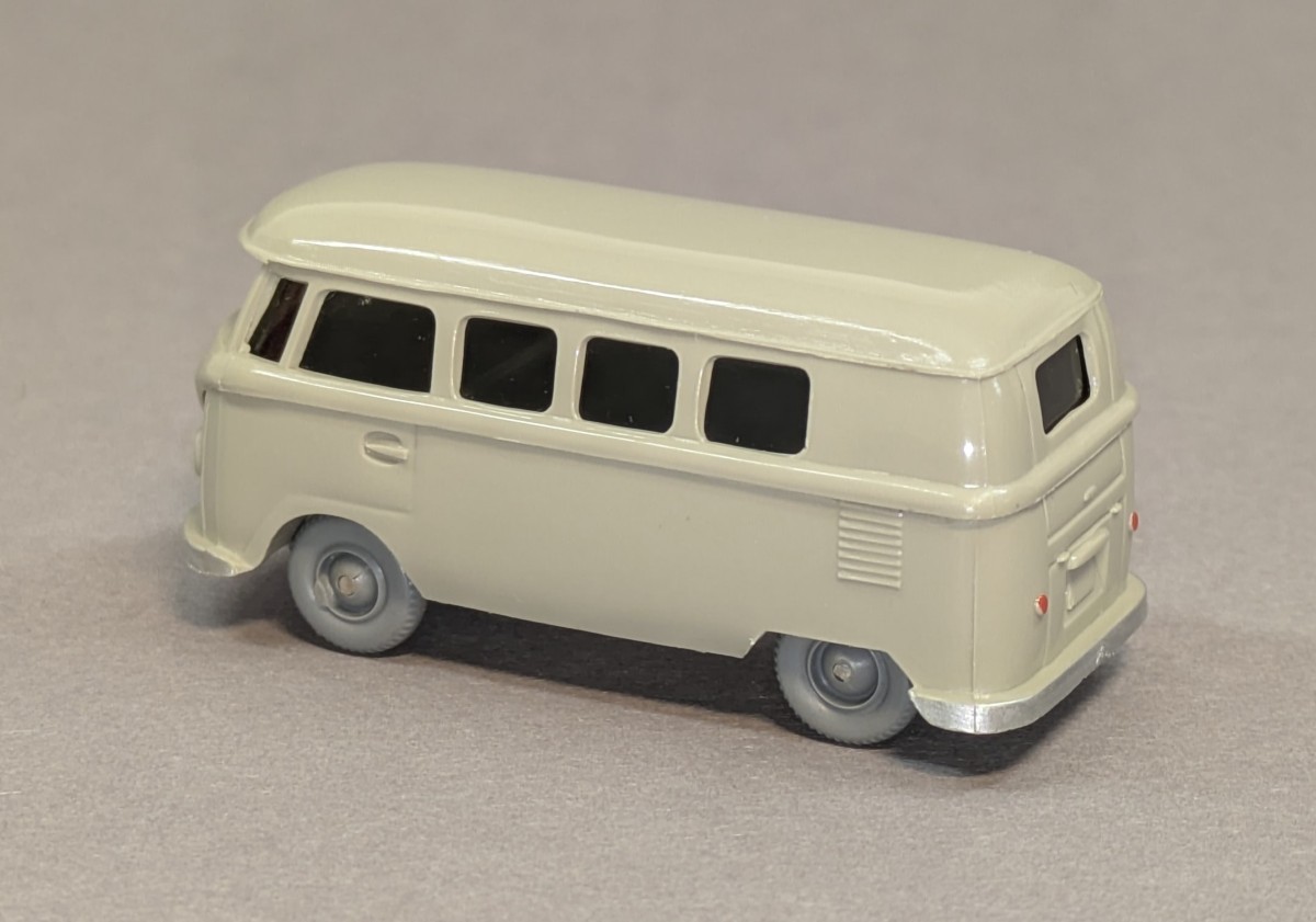 - kieselgrau- mit gering erhabenen Rückleuchten- Scheinwerfer, Stoßstangen, Rückleuchten und VW-Emblem bemalt- mit großen grauen Pkw-Rädern- GK 310/8 Zh- etwa 1961NEUWERTIGER ZUSTAND