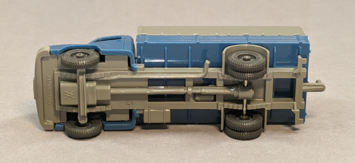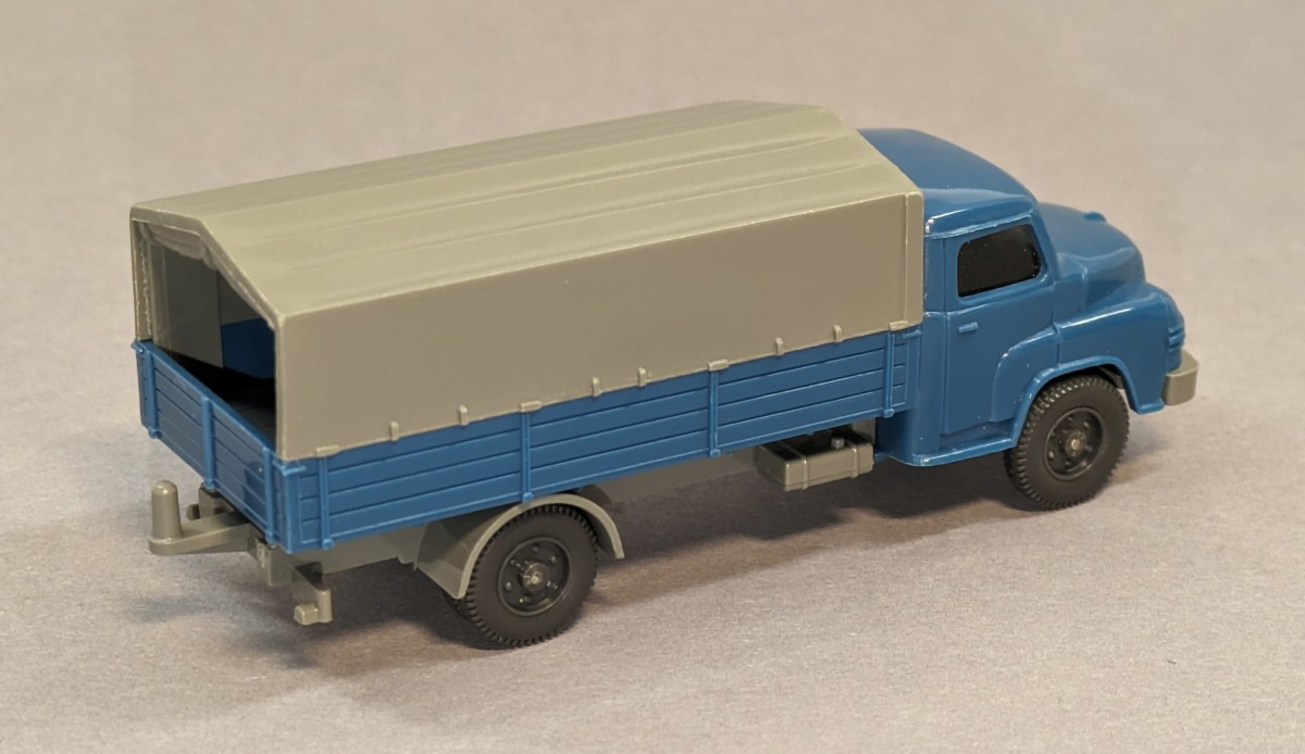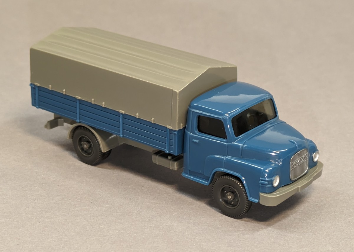 - Kabine und Pritsche azurblau, Chassis steingrau- mit steingrauer Plane- fein strukturierte Pritsche- Chassis mit Rücklichtstangen- Scheinwerfer gesilbert, ansonsten unbemalt- Räder mit feinen Radnaben- GK 410/5 LNEUWERTIGER ZUSTAND