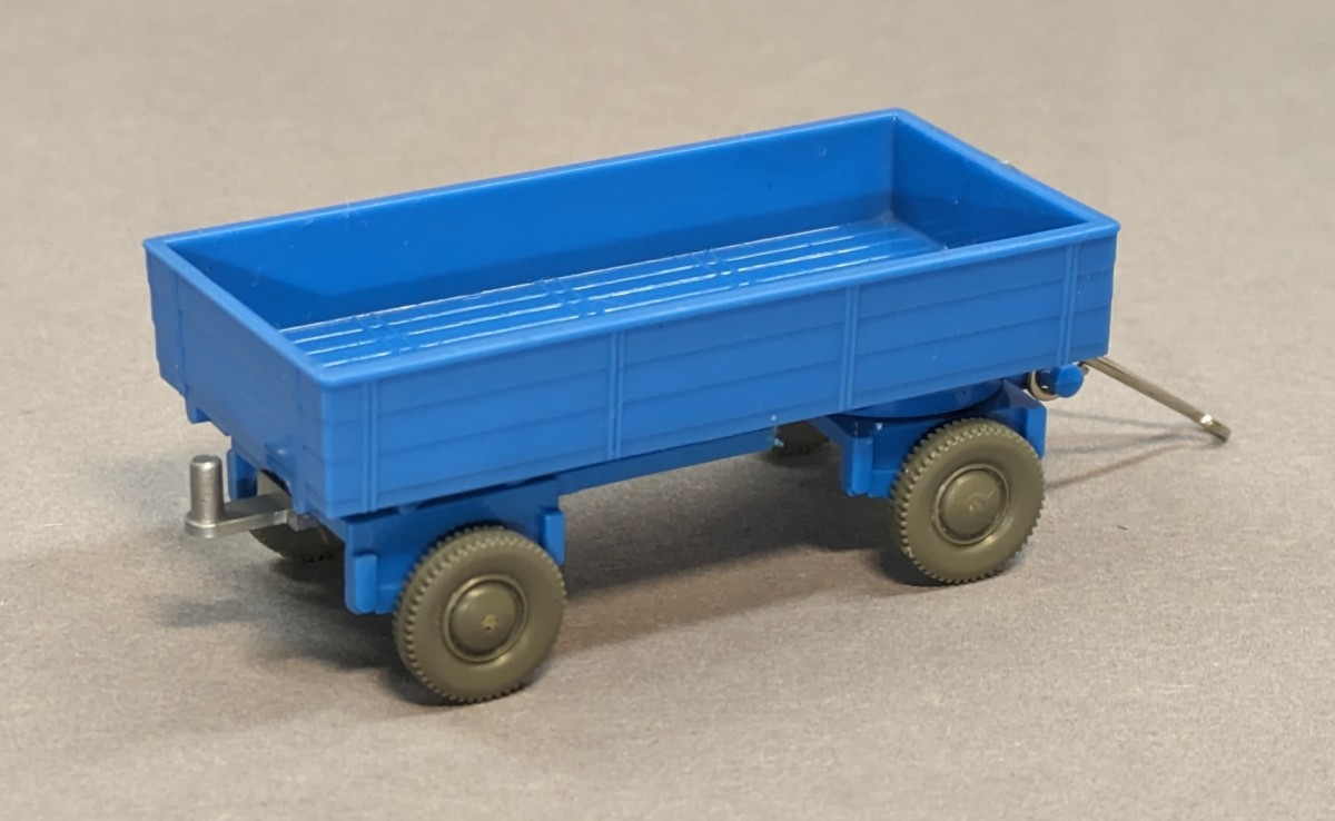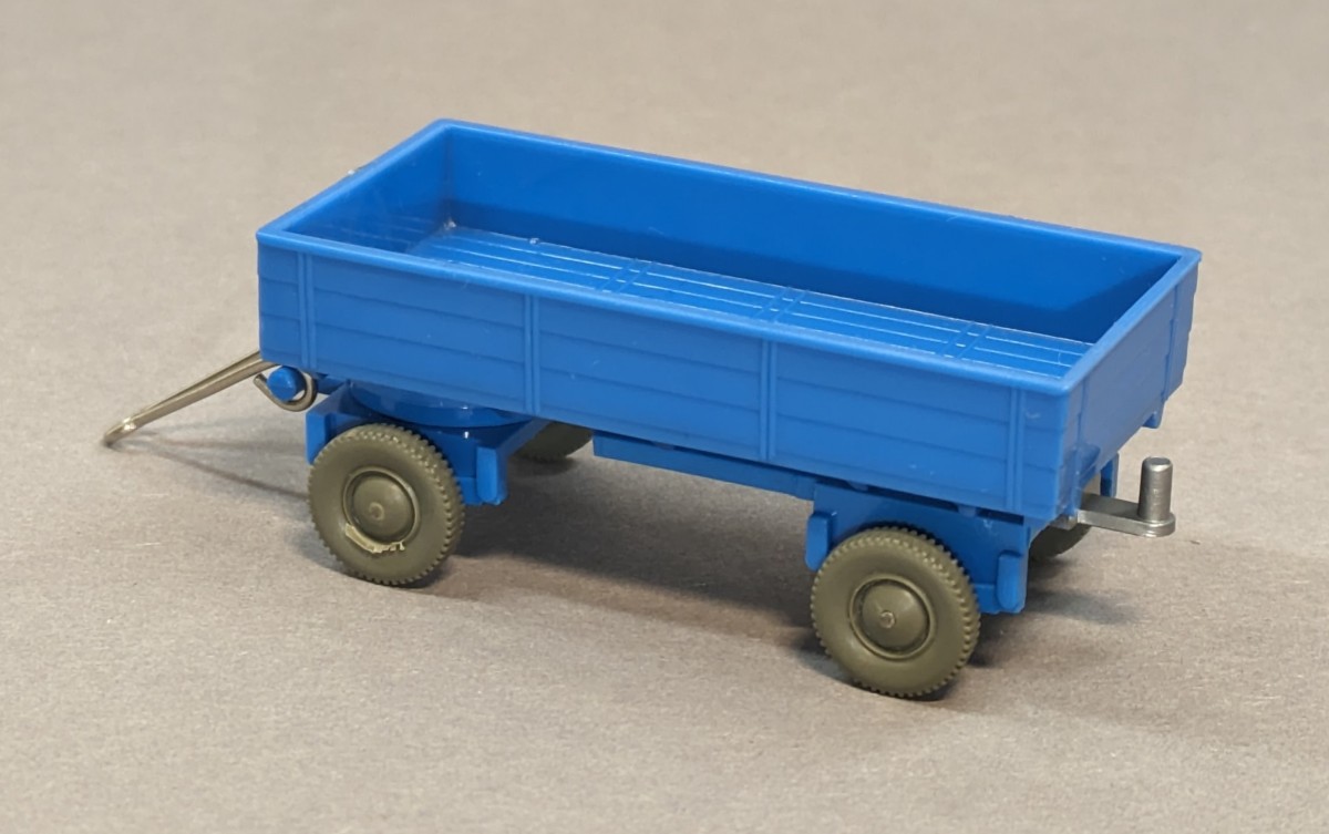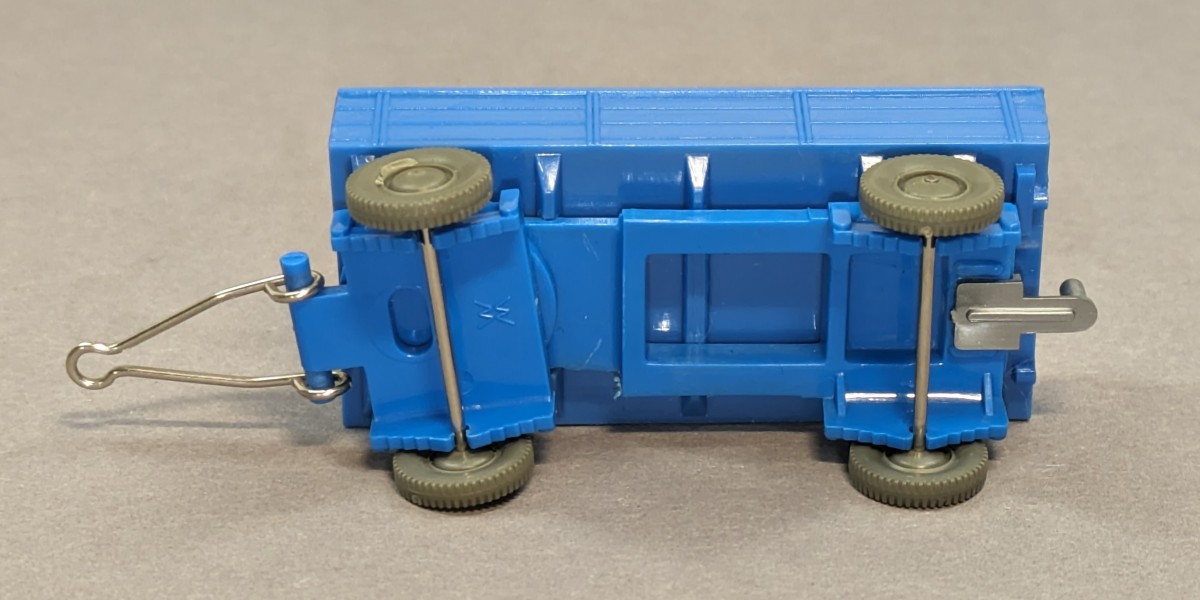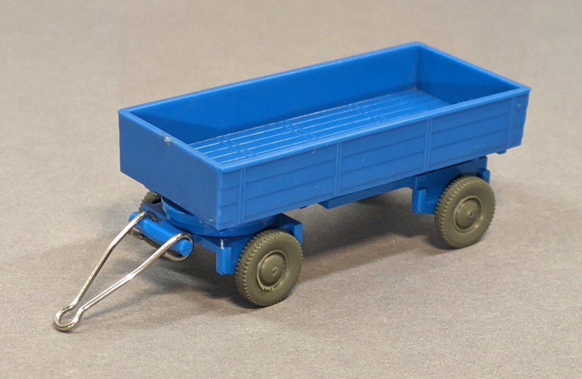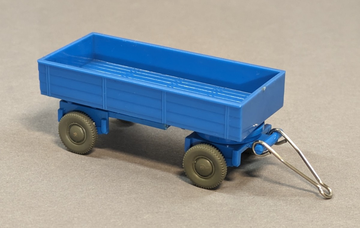 - dunkles lichtblau, Chassis himmelblau- angeklebter silberner Zughaken- einteiliges Nummernschild- mit Deichselprägung "WM"- unbemalt- GK 400/14 ? (Variante nicht erfasst)- etwa 1962/63NEUWERTIGER ZUSTAND
