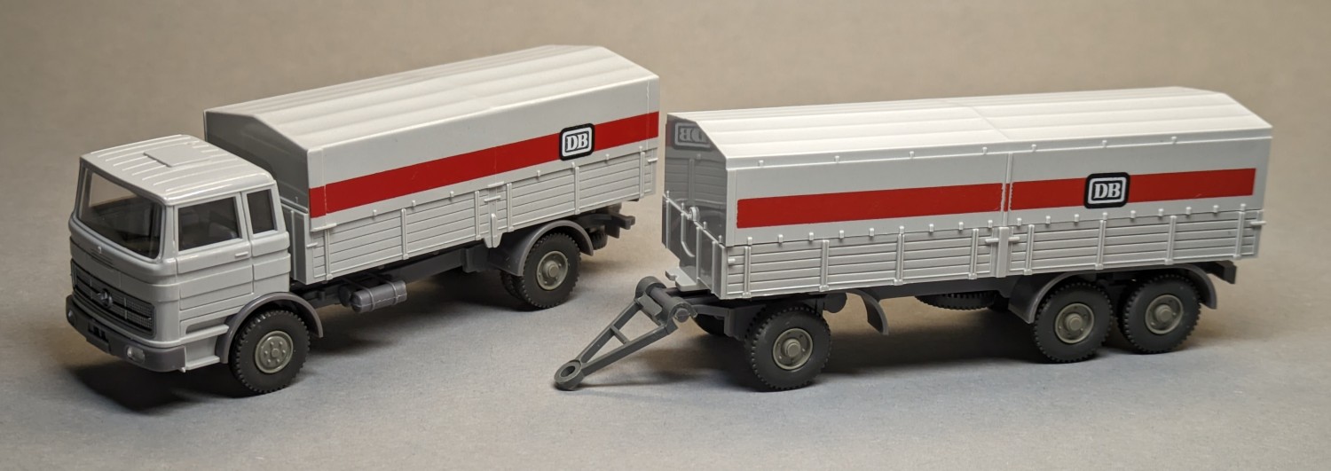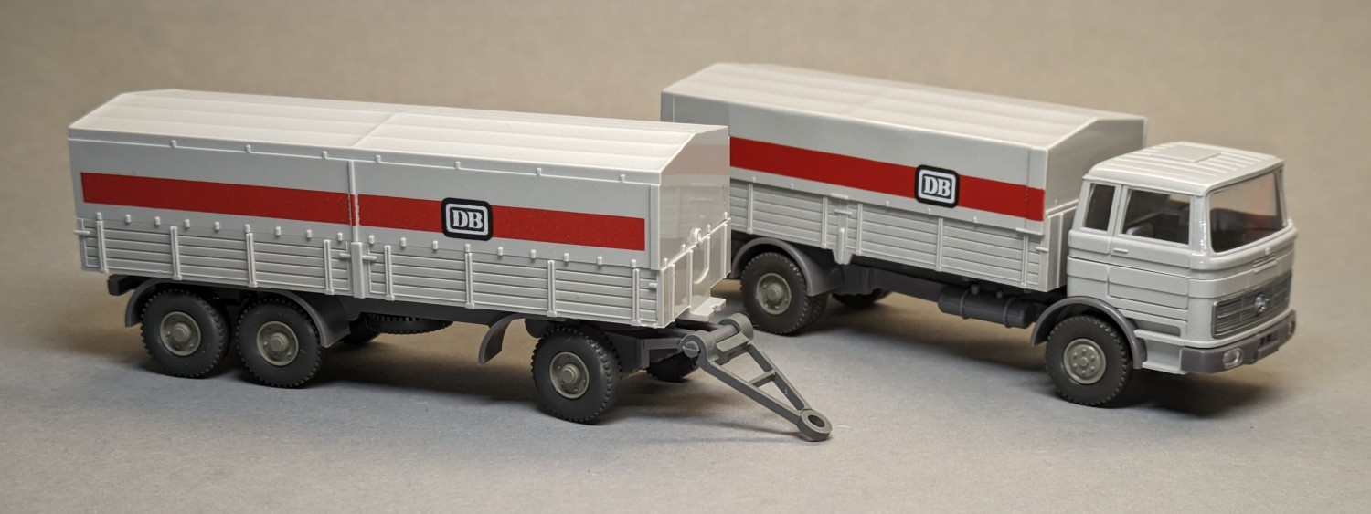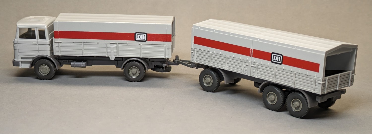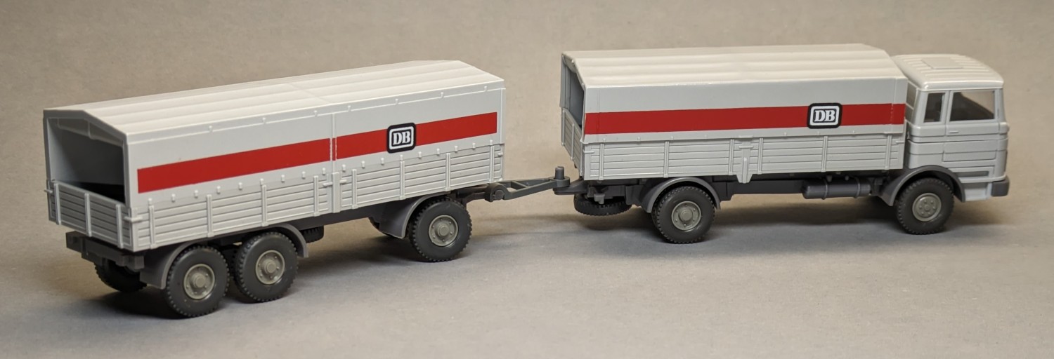 - achatgrau, Chassis basaltgrau- Druck mit breiten Zierstreifen- ohne Lenkrad- lichtgraue Pritscheneinlagen- Anhänger mit Einfachbereifungen- mit Klarverglasung- GK 432/1 CNEUWERTIGER ZUSTAND