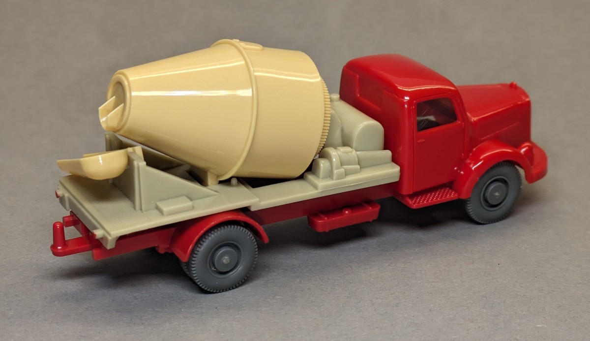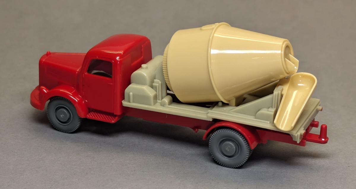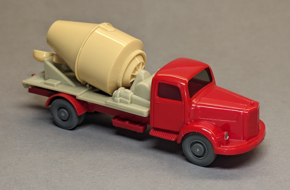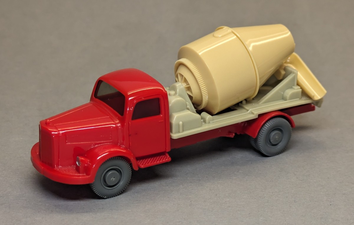 - Kabine hellrot, Aufbau hellgelbgrau, Trommel und Schütte hellbeige, Chassis rot- ohne Blinker- mit großen grauen Scheibenrädern- Scheinwerfer und Rückleuchten bemalt- GK 532/1 B- etwa 1964/65NEUWERTIGER ZUSTAND