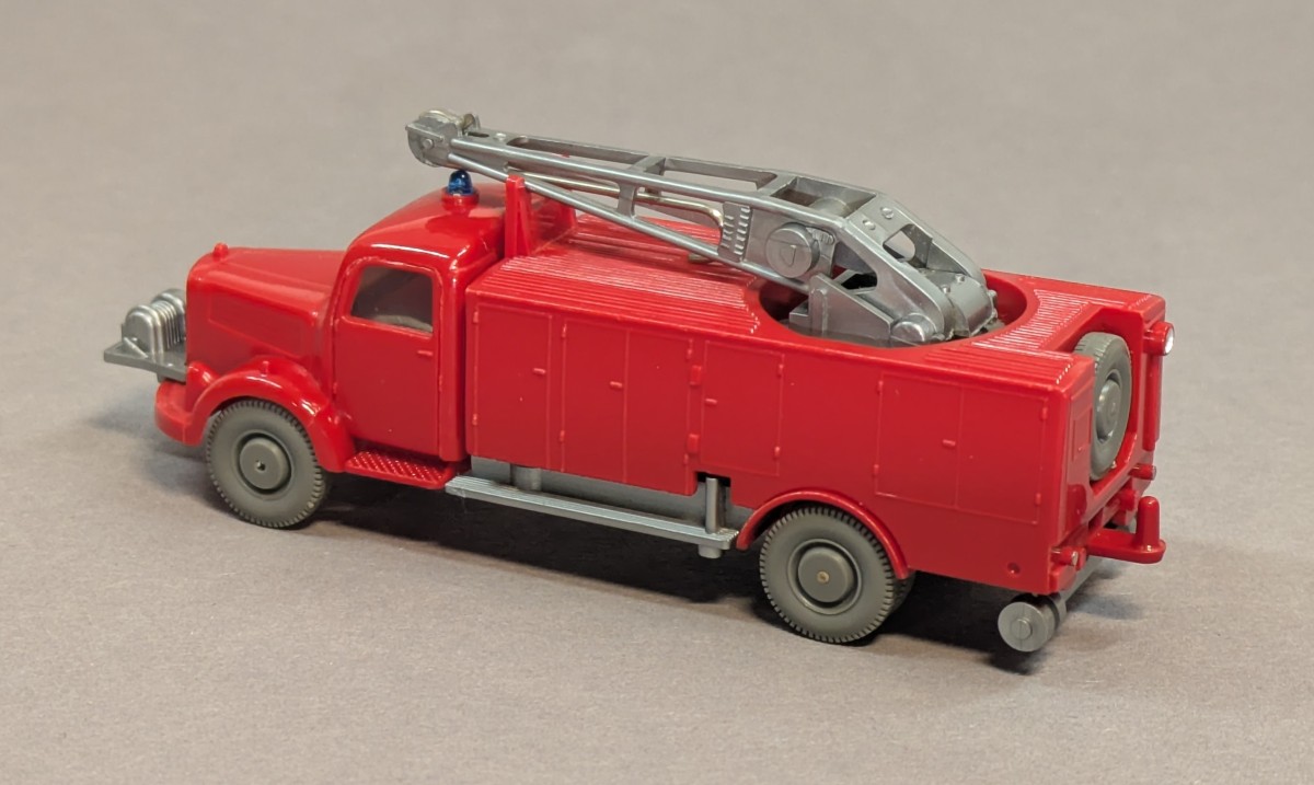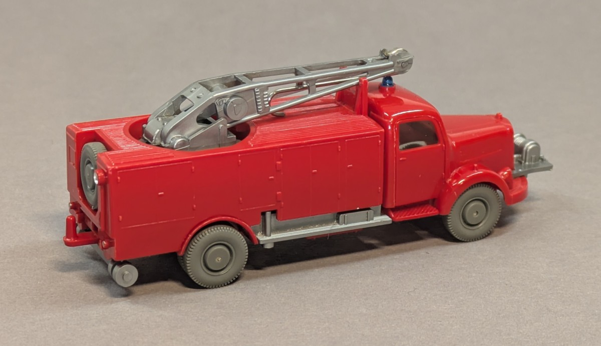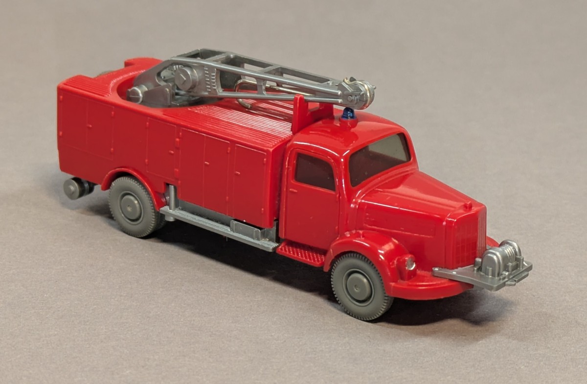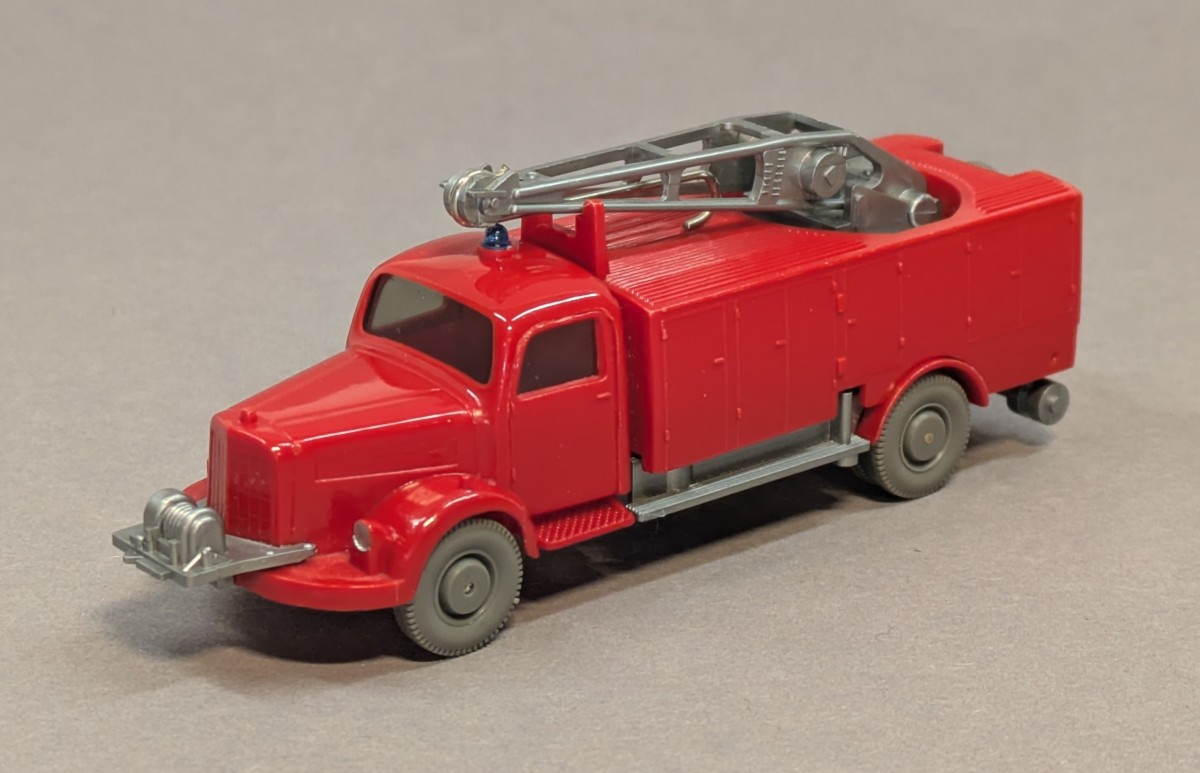 - Kabine mit Aufbau und Chassis einheitlich rot, Anbauteile silbern- mit schmaler Platte der Vorbauwinde- Scheinwerfer, Rückleuchten und hinterer Suchscheinwerfer gesilbert- große graue Scheibenräder- GK 623/1a- etwa 1965/66NEUWERTIGER ZUSTAND