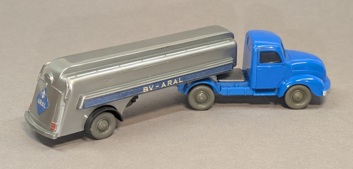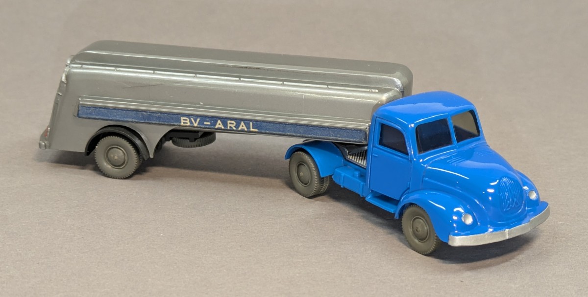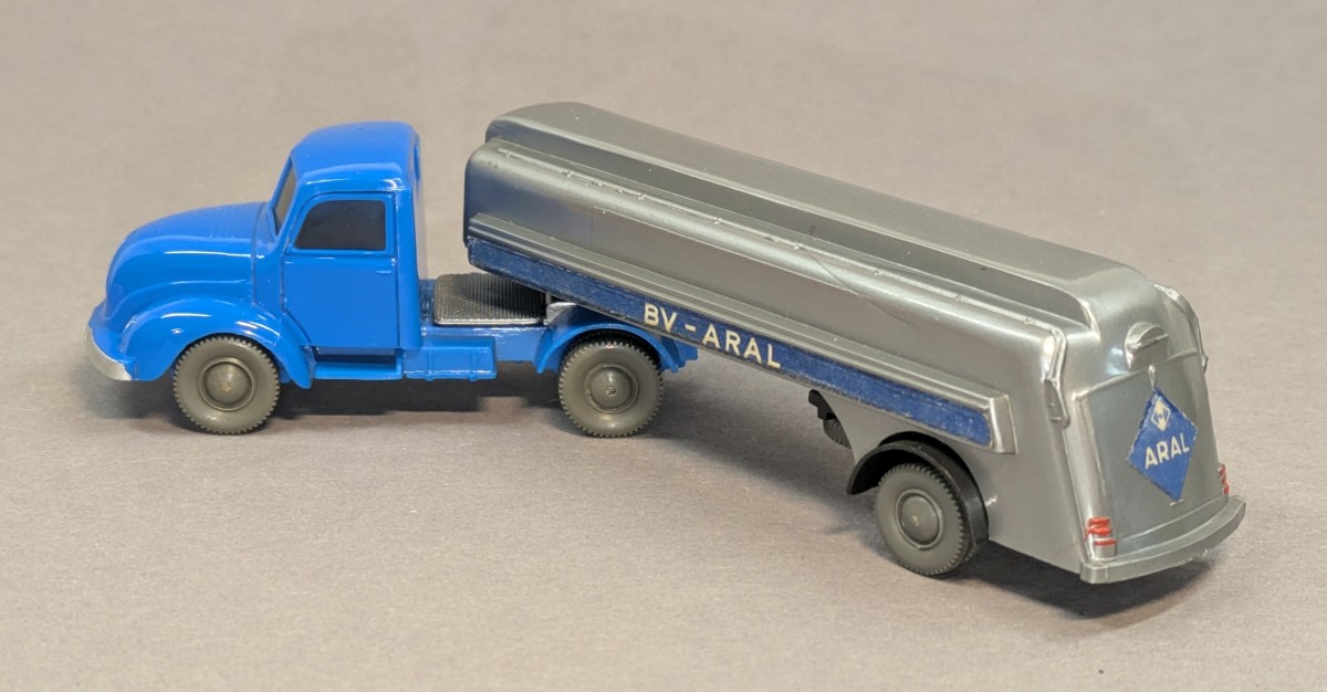 - Zugmaschine himmelblau, Chassis dunkellichtblau, Aufieger silbern mit anthrazitfarbenem Radlauf